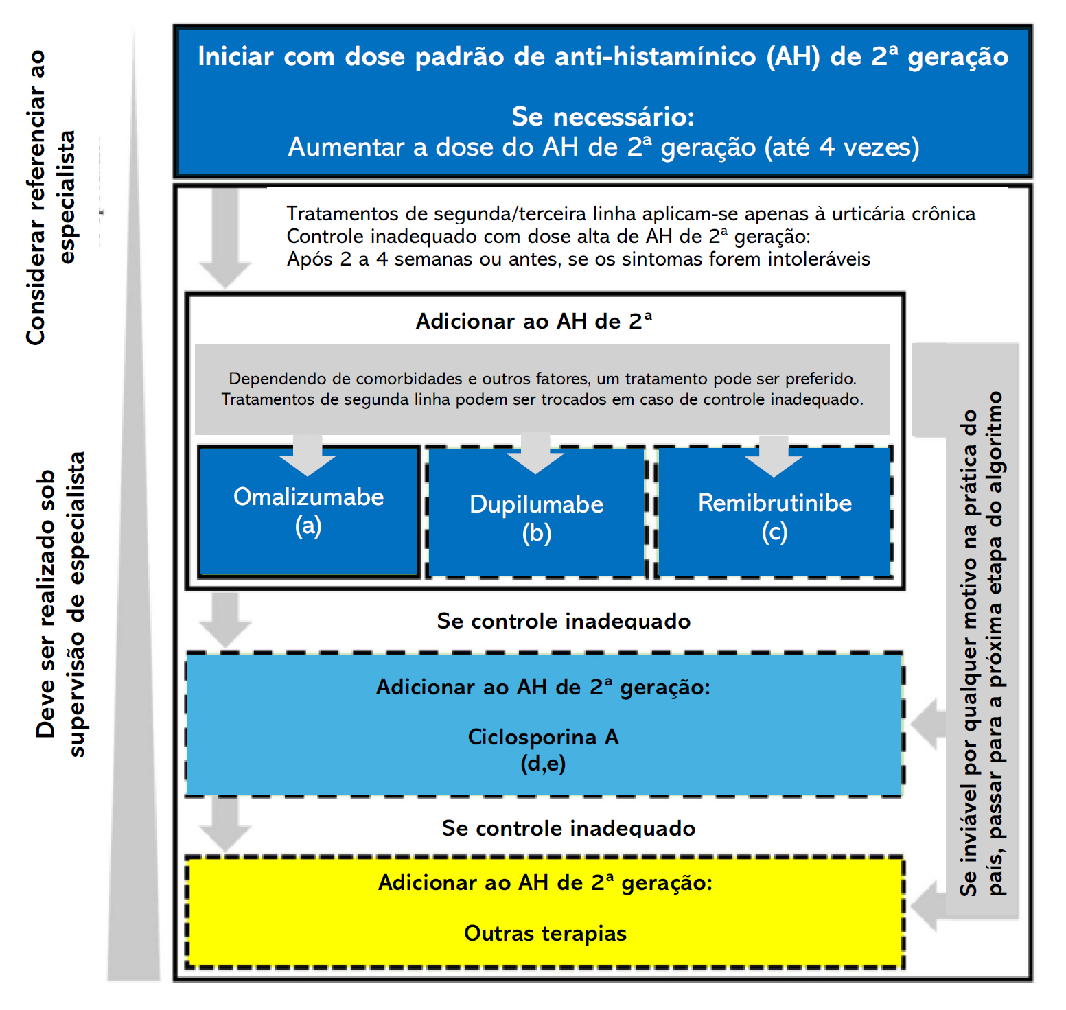 No tratamento, os anti-histamínicos H1 de segunda geração permanecem como primeira linha, com possibilidade de aumento de dose. A principal atualização está na segunda linha terapêutica: além do omalizumabe, o guideline passa a incluir formalmente o dupilumabe e o remibrutinibe (Figura 1).